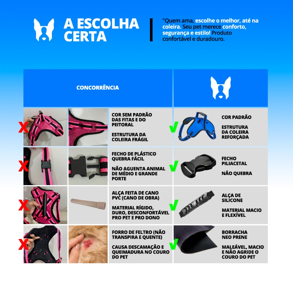 O Peitoral Califórnia foi desenvolvido para oferecer controle, segurança e conforto durante os passeios, além de ser uma excelente opção para adestramento. Produzido com materiais de alta qualidade e acabamento reforçado, ele acompanha uma guia personalizada com o nome do seu pet, proporcionando um toque exclusivo ao conjunto.