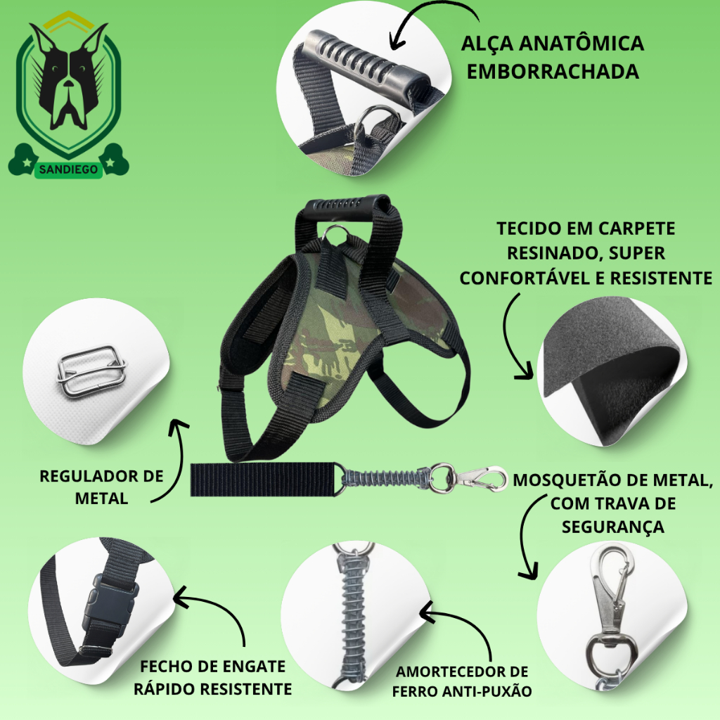 O peitoral em couro sintético foi desenvolvido para oferecer máximo conforto, durabilidade e segurança em passeios diários. Com acabamento premium e materiais selecionados, é a opção ideal para quem busca um acessório resistente, elegante e confortável para o seu pet.