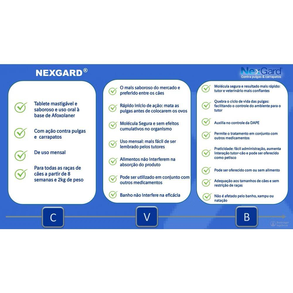 O comprimido é mastigável, palatável e com sabor de carne, tornando a aceitação fácil e agradável para os cães. Indicado para animais de 25,1 a 50kg, pode ser administrado em cães adultos e também em filhotes a partir de oito semanas de idade.