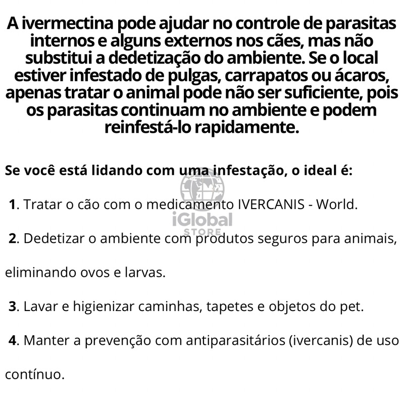 Ninguém gosta de ver seu animalzinho sofrendo com coceiras e picadas de pulgas, carrapatos e sarna. Pensando nisso, a iGlobal Store apresenta o IVERCANIS, a solução para aliviar de vez esse incômodo constante.
